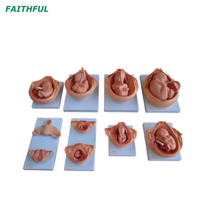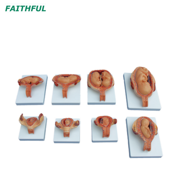 يُظهر هذا النموذج العلاقة بين الجنين والرحم في الشهر الأول والثاني والثالث والرابع والخامس والسادس والسابع ، والتوأم في الشهر الخامس.