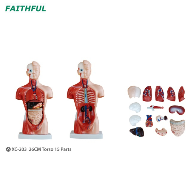 هذا هو جذع الذكور بالحجم الكامل. رسمت اليد وتجميعها بدقة لمحاكاة تشريح الإنسان. تشريح إلى 19 جزءًا: جذع ، رأس (جزأان) ، الدماغ ، الرئة (4 أجزاء) ، القلب ، القصبة الهوائية ، المريء والأبهر الهابطة ، الحجاب الحاجز ، المعدة ، الاثني عشر مع البنكرياس والطحال ، الأمعاء ، الكلى ، المثانة (جزأين) الكبد.