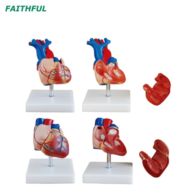 يظهر هذان النموذجان تشريح القلب البشري مع البطينين ، والأذين ، والصمامات ، والأوردة ، والشريان الأورطي بتفاصيل تشريحية كبيرة. جدار القلب الأمامي قابل للإزالة لعرض الغرف والهياكل الداخلية.