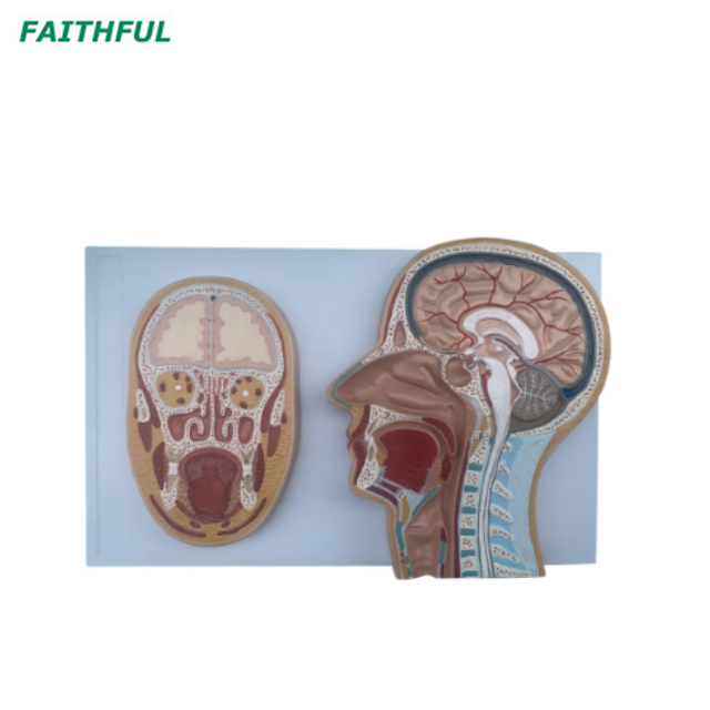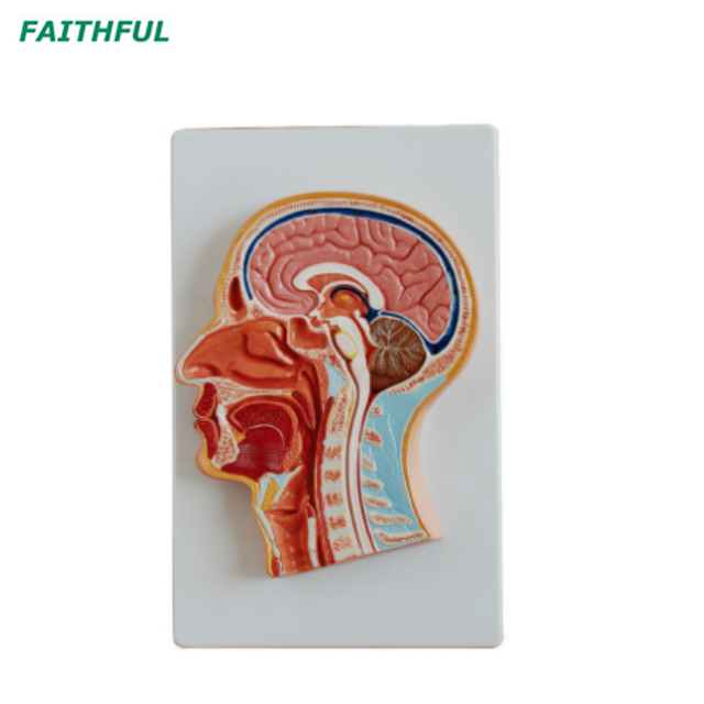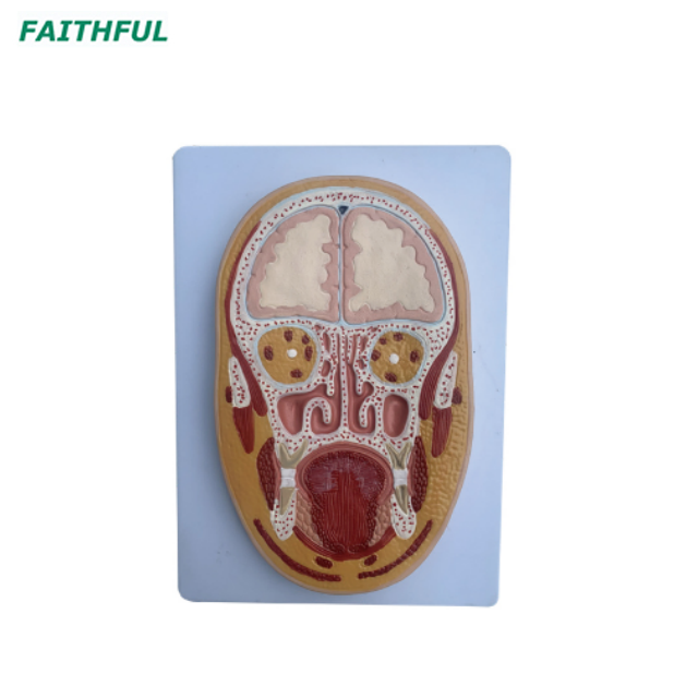 يوضح هذا النموذج القسم الأمامي من الرأس يمر عبر عظام القحف والدماغ الأمامي والدورة اليمنى واليسرى والتجويف الأنفي وتجويف الفلفل والتجويف عن طريق الفم.