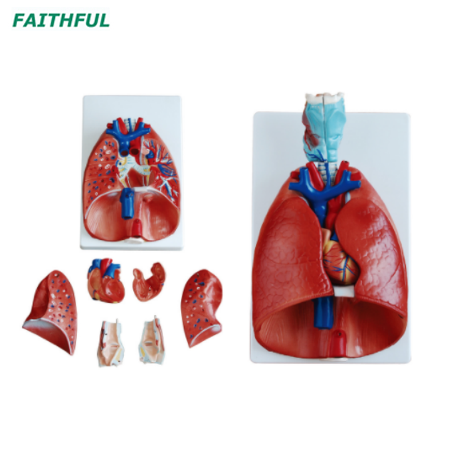 يتم فصل هذا النموذج بالحجم الطبيعي إلى 7 أجزاء. لدى Thelungs فصين قابلة للإزالة لإظهار البنية الداخلية ، وفرشاة القلب التي تبين الأذين ، والبطينين ، والفصائل الحنجرة ، و isshown.on الحنجرة.