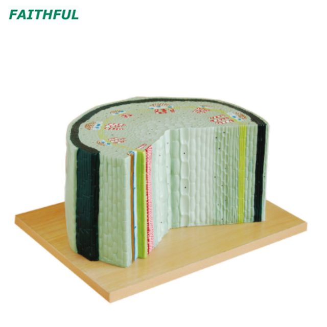 يوضح هذا النموذج من جذع الذرة تفاصيل التشريح الخلوي الأحادي المعمم في المقطع التقاطع والطولي.